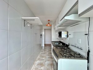Cozinha convencional (fechada) equipada com armários planejados, fogão, filtro e coifa.