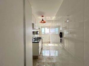 Piso vinílico na sala e quartos e porcelanato na cozinha.